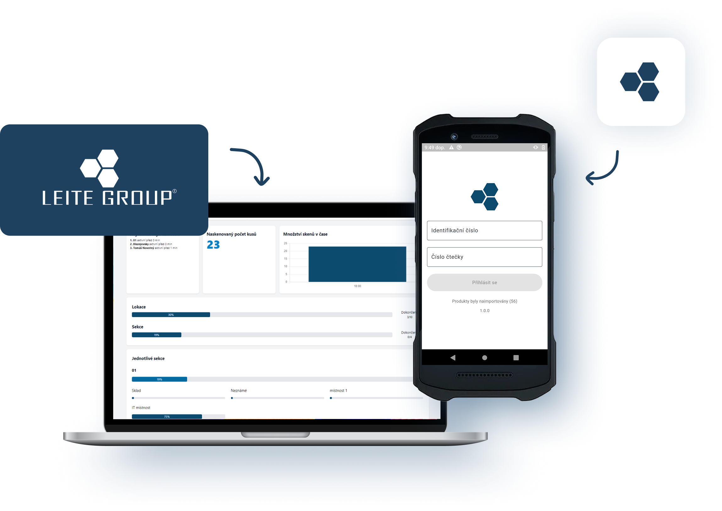 Po připravení inventury na cloudu je nutné se přesunout do již nainstalované desktop aplikace. Zde se přihlásíte, stáhnete inventuru a následně připojíte PC ke stejnému routeru jako čtečky pro přenos dat.